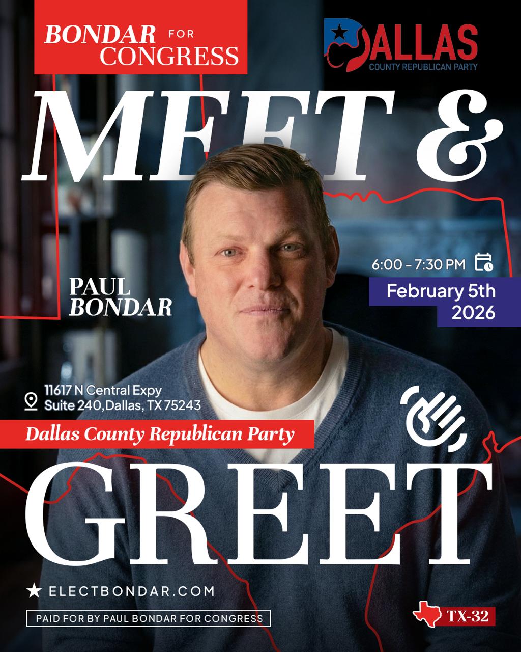 Dallas County Republican Party allows local candidates to share campaign events on our calendar and allows candidates to host meet & greets at our headquarters. Not an endorsement.