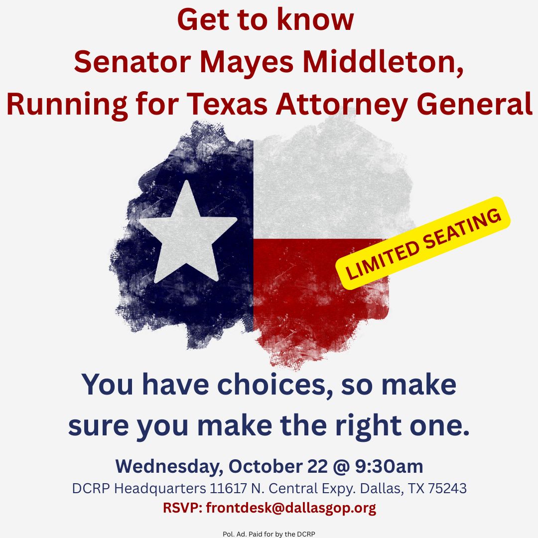 Meet Seantor Mayes Middleton Running for Texas AG RSVP: frontdesk@dallasgop.org