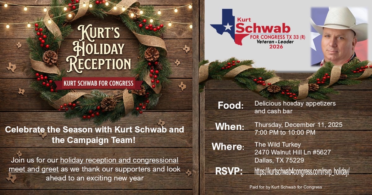 Join Kurt Schwab and the campaign team December 11 as we celebrate Christmas! We’ll have appetizers on hand, music and a cash bar along with a few speakers at The Wild Turkey.